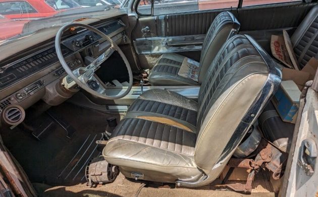 Although it needs refreshing, much of the interior is still present. The dash and front buckets show some cracking, with the driver’s bucket also having a split, but it’s fun to see that the captain’s chair is power-assisted. The console has switches for the four power windows, but the vent flaps are cranked open manually. It appears that the headliner is gone, but if it’s just a driver-quality Starfire you’re after, it’s possible the back seat can be cleaned up adequately and salvaged.