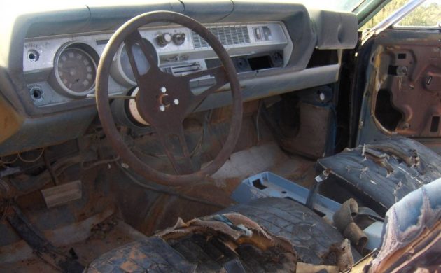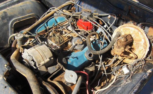 Probably the best news is that the Olds seems mostly complete on the outside, including a lot of the trim. We don’t get any background here, and the seller sounds a bit optimistic when he says this one’s in great shape for the year. No specific information regarding the body is mentioned, but hopefully, not a lot of actual rust has developed on the panels, although there’s plenty of patina. Maybe a considerable amount of the exterior sheet metal will be salvageable, but the rear bumper has been tapped, so this will either need to be straightened or replaced.