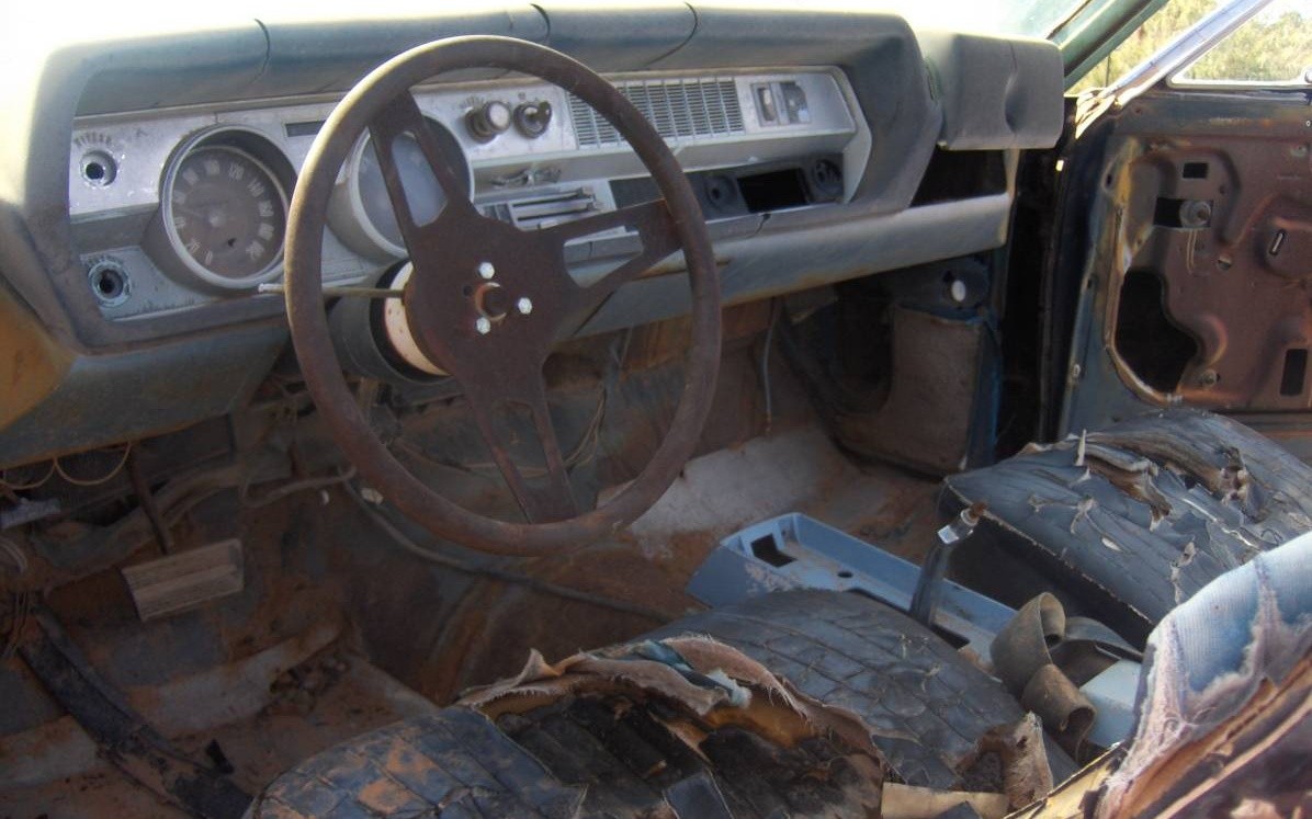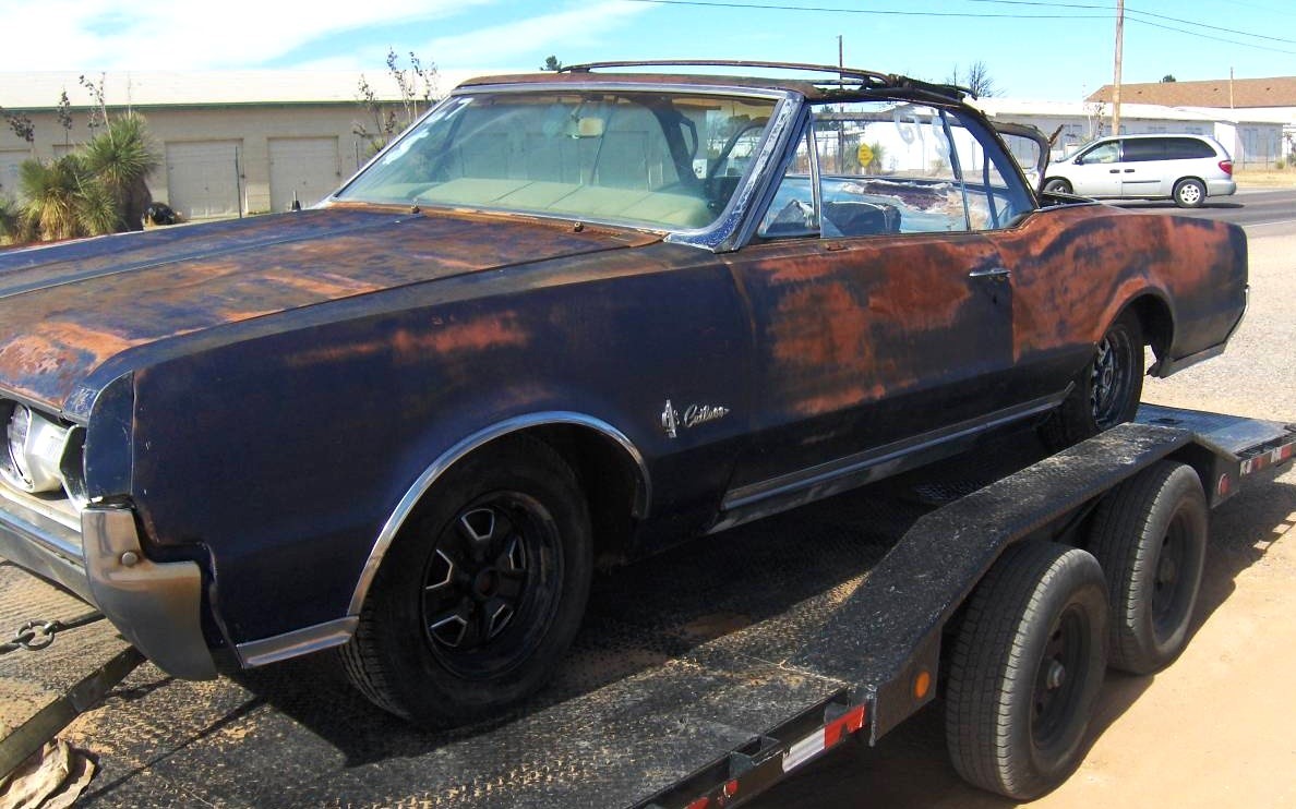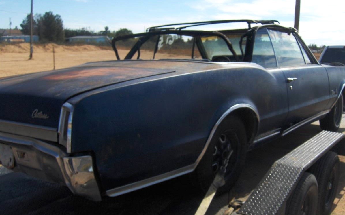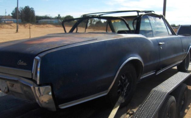 To quote a line from Joe Dirt in his movie when his oil rig buddies called his car Rusty: Awe that Sh__ will buff out! This looks too far to even call a parts car by most standards. The engine is not original as a 67 330CI would have been used and it would be gold with out an HEI or an EGR valve. Most likely this engine is from a mid 70’s Low compression car. The interior will be costly and needs everything. It is definitely not in great condition for its age. What is worth using is the boxed frame, the unrusted body panels, trim, doors, quarters and that’s about it. The rear end is unspecified but most likely is a 10 bolt Olds open diff. It would be a perfect donor car to repair a 66 or 67 cutlass that had accident damage and needed a good frame, fenders, doors and quarter panels.