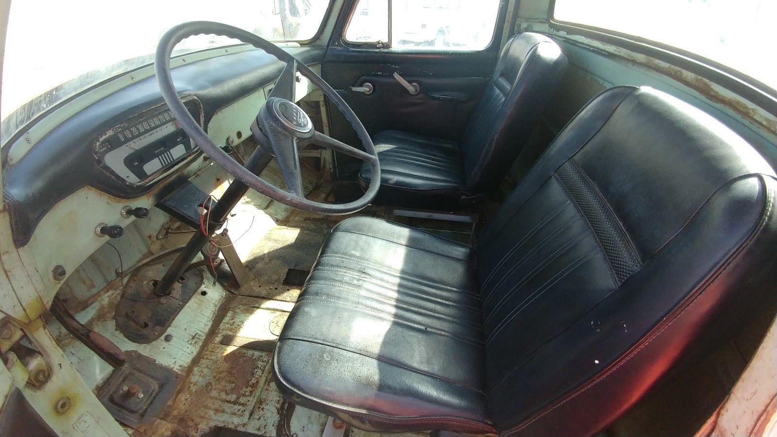 The inside doesn’t help much, with a light blue-green in this picture over most of the metal, but the very rear of the cab is painted a darker light blue. It also looks like the original bench seat was still present when that part was painted. Currently the truck has early Mustang bucket seats; a choice that would be oddly expensive now but I’m sure made sense at the time.