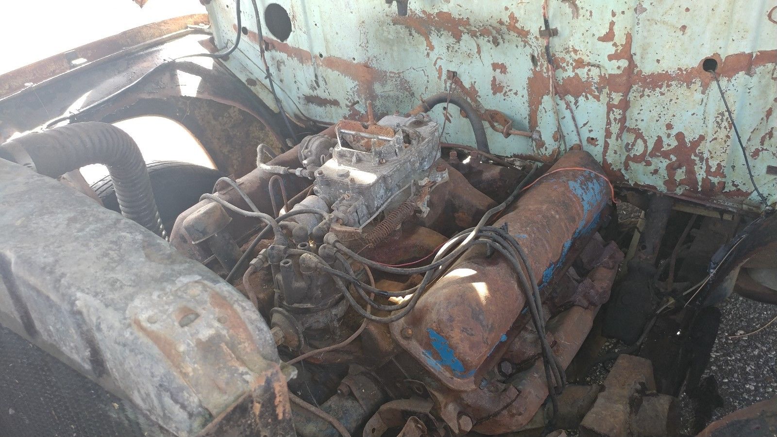 Looks like a late model FE motor, possibly a 390 or 428, probably out of an LTD station wagon. The original engine would’ve been the 239 Y-Block which wasn’t the greatest ever built but served the purpose fairly well. It could also have been powered by a 223 six. The ‘Seasick blue’ looks like a standard color. I think that Ford offered about 8 different colors for the trucks back then, and somehow ended up with a bunch of light colors for some reason; I think red, black, green and blue were the only deep colors besides Airsick green, Calf scour yellow, Specimen yellow. They looked anemic for years.