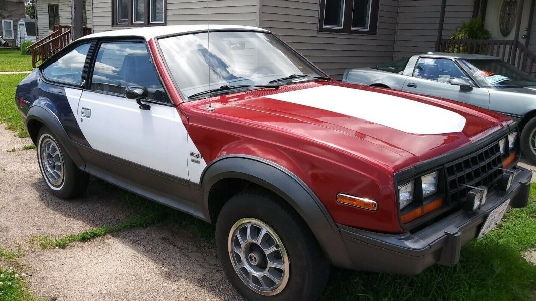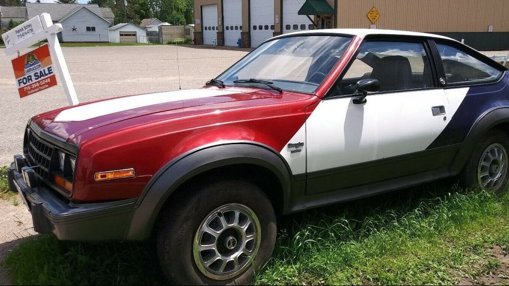 Well, here’s a patriotic son of a gun. Kind of ironic, a car company called “AMERICAN” Motors, failed. I have a friend that had this exact car, sans paint job, his was red, and from Wisconsin, for all I know, this could be his. It was a great concept, and was a nice car, okay gas mileage, for a 4×4, great heater, but had one flaw, the 5 speed. He bought it new, and was okay for about a year, then the trans began growling. He took it in, at the time, it was new, and parts were scarce, he waited about a month to get the car back, it was ok for a couple months, it began growling again, this time the dealer had it for 2 months, said they couldn’t get parts and he traded it. I think the automatic was a better unit, but a great find, if the trans is okay, that is.