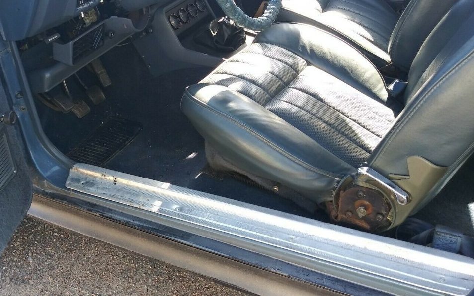 The interior is referenced as having new carpet and seats that are in “great shape”. The interior images are stilted in such a fashion that a comprehensive view is never revealed. This one image shows a driver side dashboard that is losing its lower portion, not sure what, if anything, that indicates. Agreed, the seat upholstery is in good nick but the cover for the seatback pivot bracket is missing.