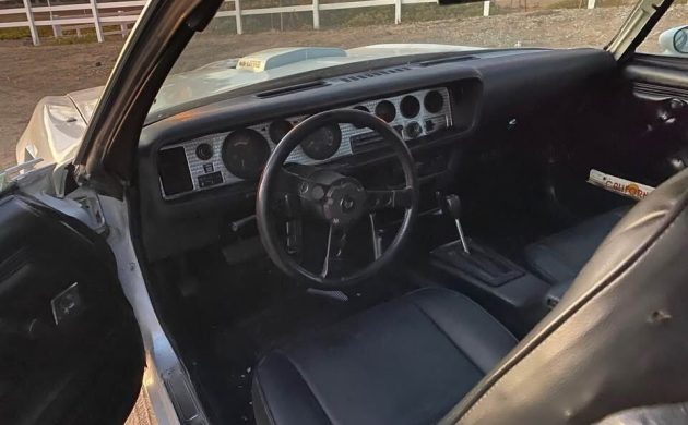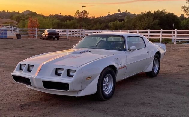 The Trans Am is rolling on aftermarket chrome wheels and blackwall tires. The white paint and black interior is a classic look. Pontiac produced over 117,000 Trans Ams in the 1979 model year. This one looks to be in great shape.