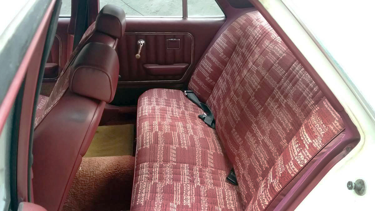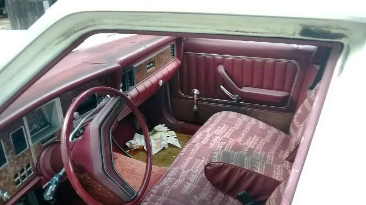 Back to this white over red Granada. You can see a couple of cracks in the dash top and a dirty arm rest, but otherwise it looks like a nice car inside, too. It’s hard to beat a red interior especially when it’s in a cool 1970s pattern!