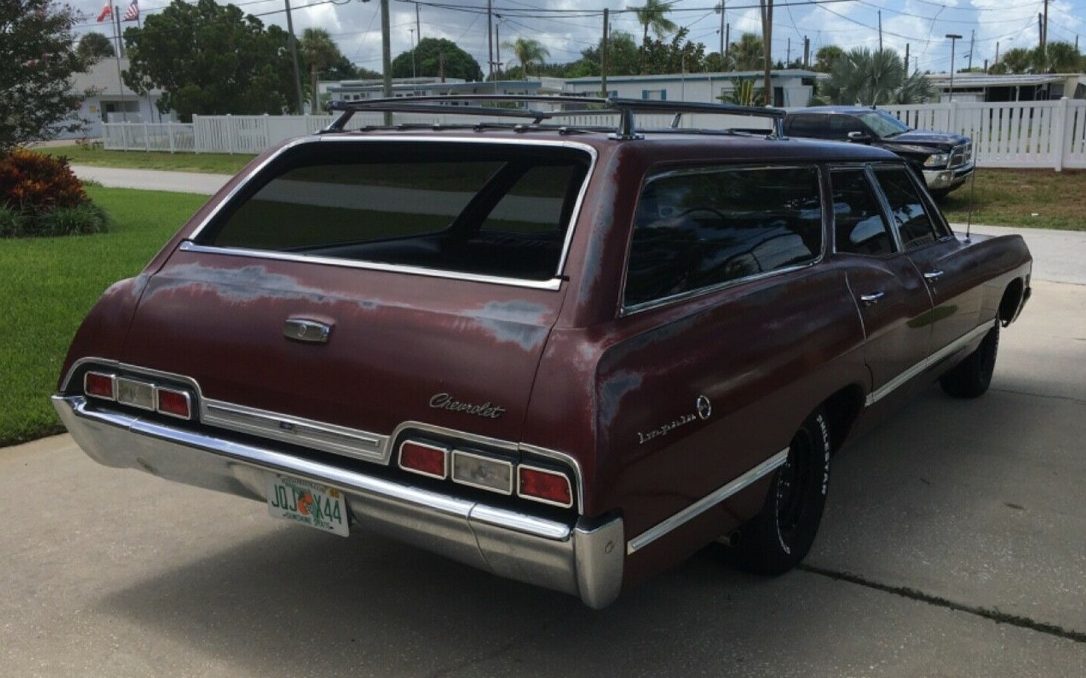 This Impala wagon is a claimed 55K mile Florida original example and the body and underside are in solid condition – no sign of rot or crash damage. The Maderia Maroon finish is described by the seller as such, “Paint job is Patina to look old”. Actually, it’s a typical GM dark red lacquer that is known for oxidizing, it probably started long ago and the Florida sun hasn’t done it any favors. Some consider the “burned” look to be a popular, current trend, others not so much so. That said, the exterior is really very presentable with good chrome and intact trim. Of note, the ’67 Bel Air was the only version of that trim level to employee three taillights on either side of the tail panel/bumper, a styling cue that had been Impala-only territory for years. In ’68, all was well with the world as the Bel Air was demoted back to two taillights only, adorning either rear side.