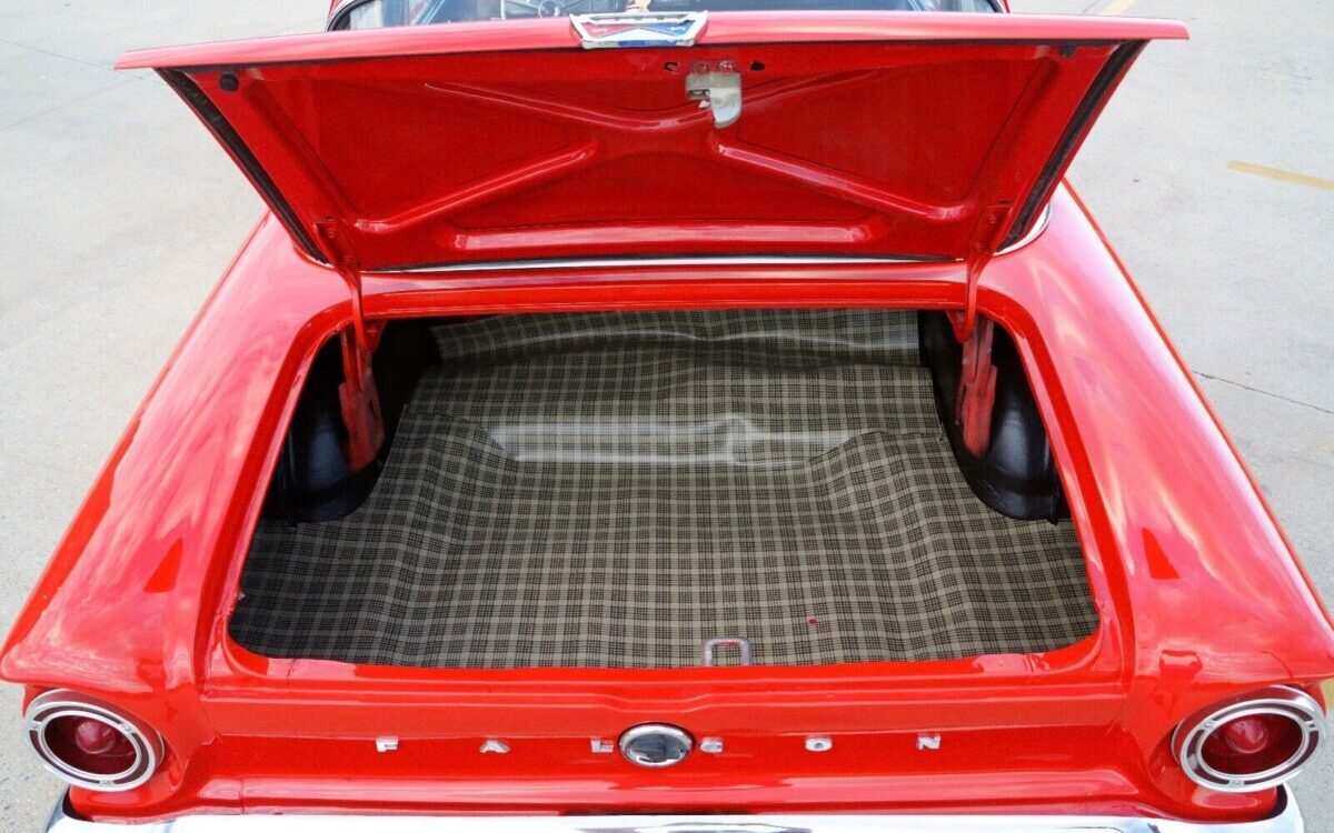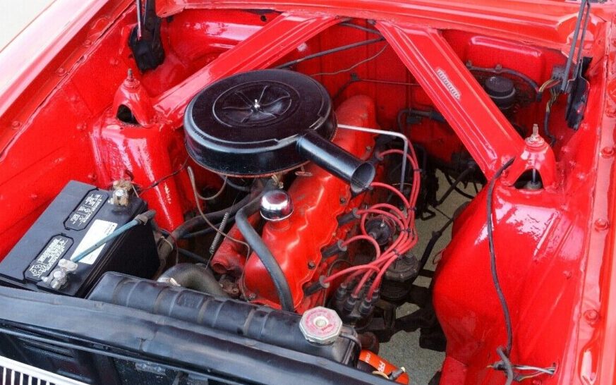 Projecting a real sleeper vibe, this Falcon looks like it’s ready to rumble, but alas, it’s powered by a 120 HP, 170 CI, in-line, six-cylinder engine so the rumble is more like humble. That said, the engine’s appearance is a visual feast – I don’t know if all of that under-hood red is correct, but there’s certainly no missing it. Attached to a Fordomatic, automatic transmission, there’s no mention as to how the six-banger performs or what mechanical activity it has experienced.