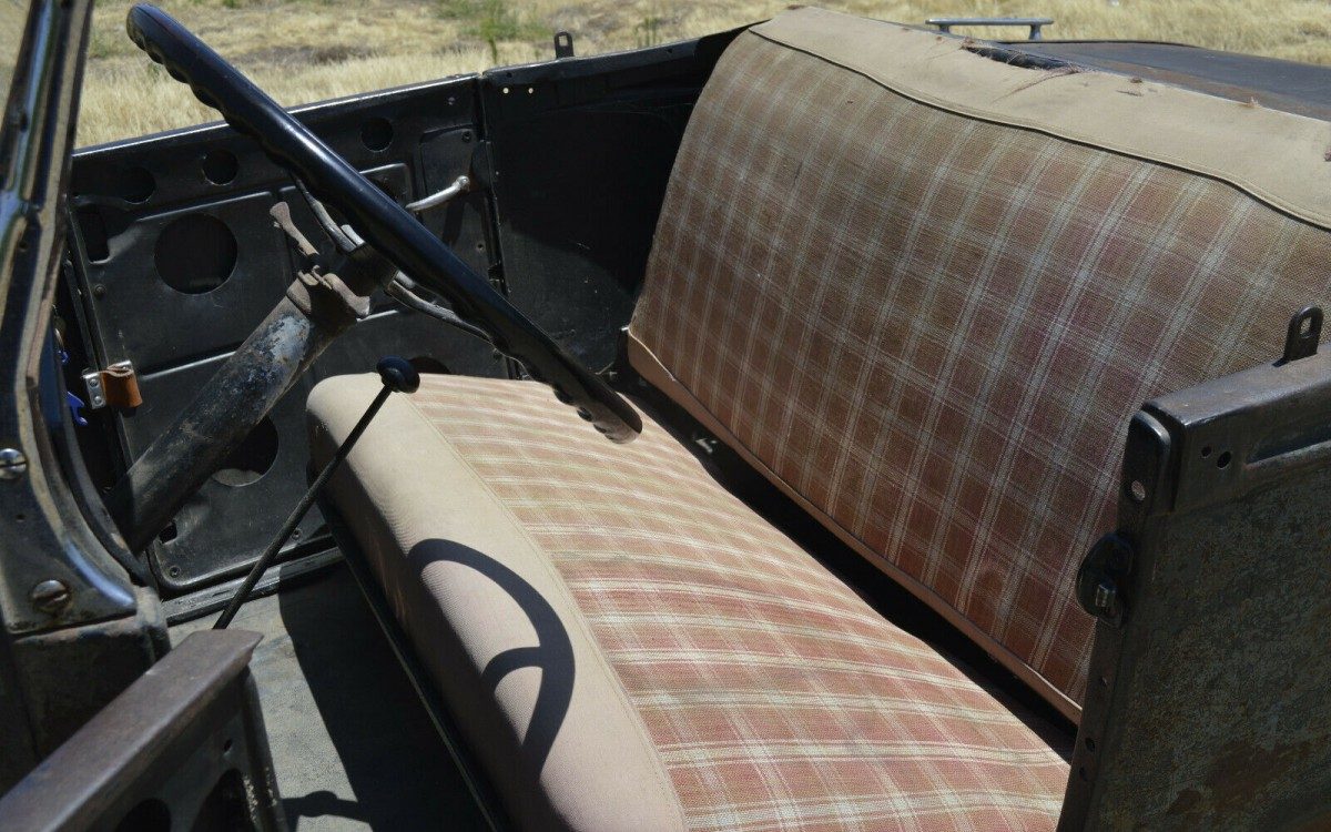 There’s nothing special inside. The plaid bench seat looks just right. There appears to be no attempt at restoration, just function. There’s a floor-mounted shifter, but all appears to be standard-issue 1929 Ford.