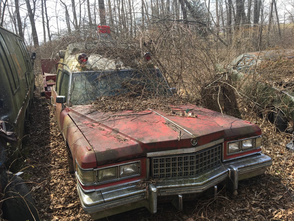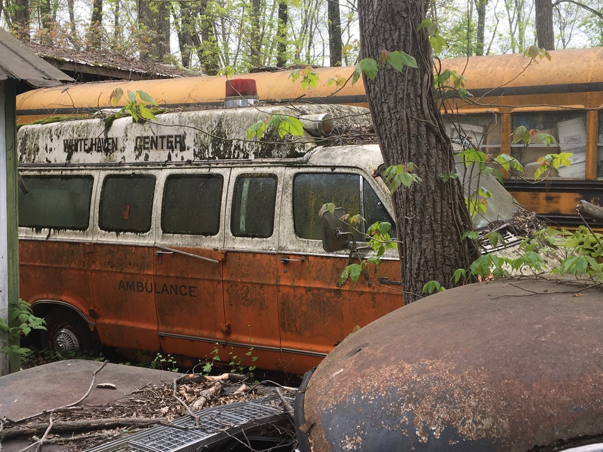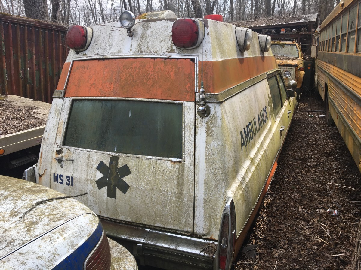 I love old junkyards , but In all honesty most of this should have been crushed out when steel prices were high a few years ago . Old buses , junky box trucks , rotted out mid 70s Caddy ambulances and stripped out beat up cruisers with no drivetrains aren’t worth a heck of a lot and never will . The earlier Ambulances and hearses here are only good for their trim and lights ; most ambulances and hearses are well maintained, so people who collect them usually have good cars to start with and have no need for a rotted carcass . The early 50s four door sedans that sit here are the same way; I cant see anyone pouring money into restoring one of these , just trim parts and they aren’t particularly rare . It also seems like every old time yard saves Packards and Studebakers , but its a limited market, and unless they are rare (like the Packard ambulance and 66 Lark ) , they will just rust away like these have. The only ones that caught my eye was the Checker cab and the 74 Dodge Royal Monaco -that is a complete looking former cruiser and is the same model as the Blues Brothers car -he wont have problems selling that !
