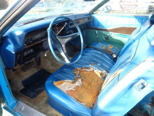 The interior looks original with a crack in the dash, faded carpet and torn vinyl on the bench seat. The car has manual windows but all the glass is said to be good. Originally, the car had a white vinyl top but that has been removed. There is surface rust on several surfaces and the trunk has a small hole in it. Underneath, the car looks more solid but the body panels are either scratched or dented and the driver door appears to have been replaced at some time.