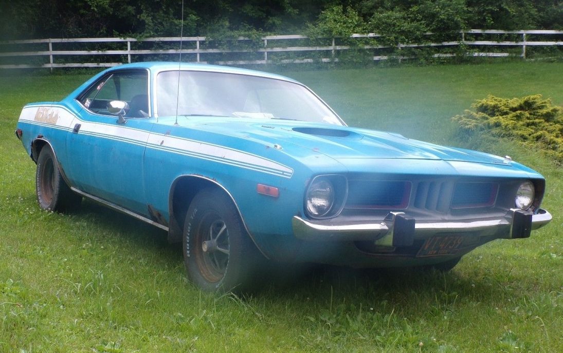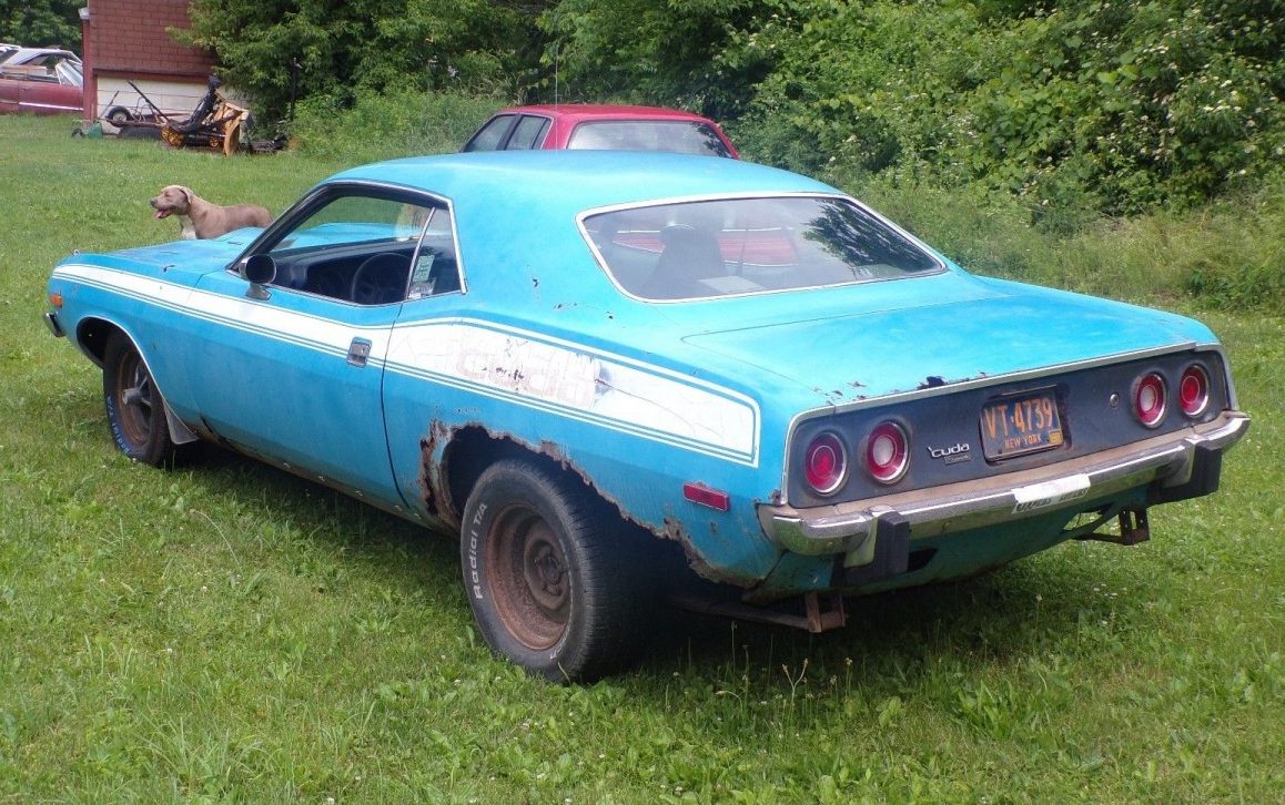 I had the same car, same color in 1983, but with the vinyl roof. The âCudas were more desirable than the base model, as they came with the cooler hood. Mine was actually nearly as rusty as this example. I paid $400 for it, with no engine, pulled a running 340 out of a junkyard (which was easy to find at the time) and bolted it in. No good repro quarters were available, so I did the best I could with JC Whitney panels and bondo. Cragars, shackles, and a pep boys cassette deck completed the mullet mobile. Had a great time with it for a couple years and moved on to a sad faced 73 Challenger. Itâs amazing how many of these were around back then. They just werenât as popular for teenagers like me as a Camaro or Nova. The guy who bought my Cuda dropped in a 440 and drag and street raced it. He was bummed on the initial swap as the 72 and up cars werenât designed for the weight of a big block and he had to redo the front suspension.