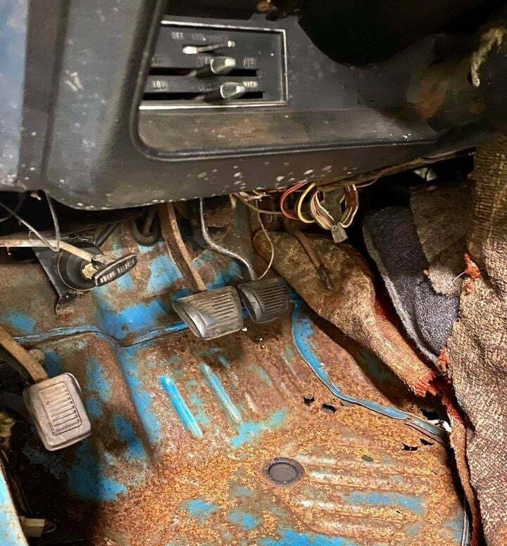 For 1972, just 1,700 ‘Cudas were built with the 340 cubic inch engine and a 4-speed tranny. Add to that the rarity of the color and – if true – you may have yourself a car that once was rare. But the drivetrain is gone, yet the clutch pedal remains. A non-running 318 and TorqueFlite automatic are there now.