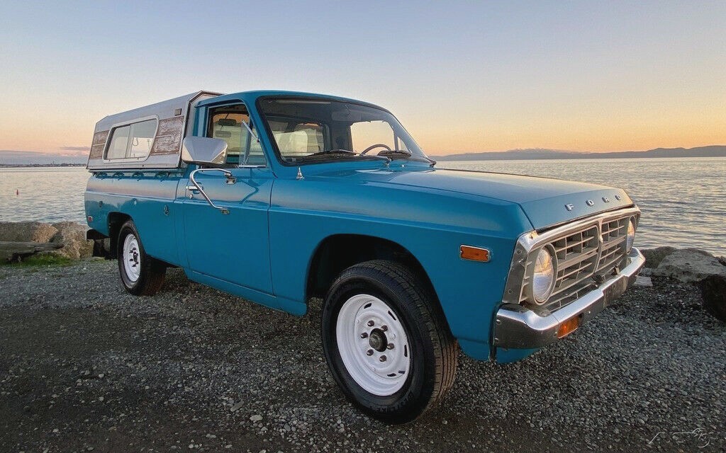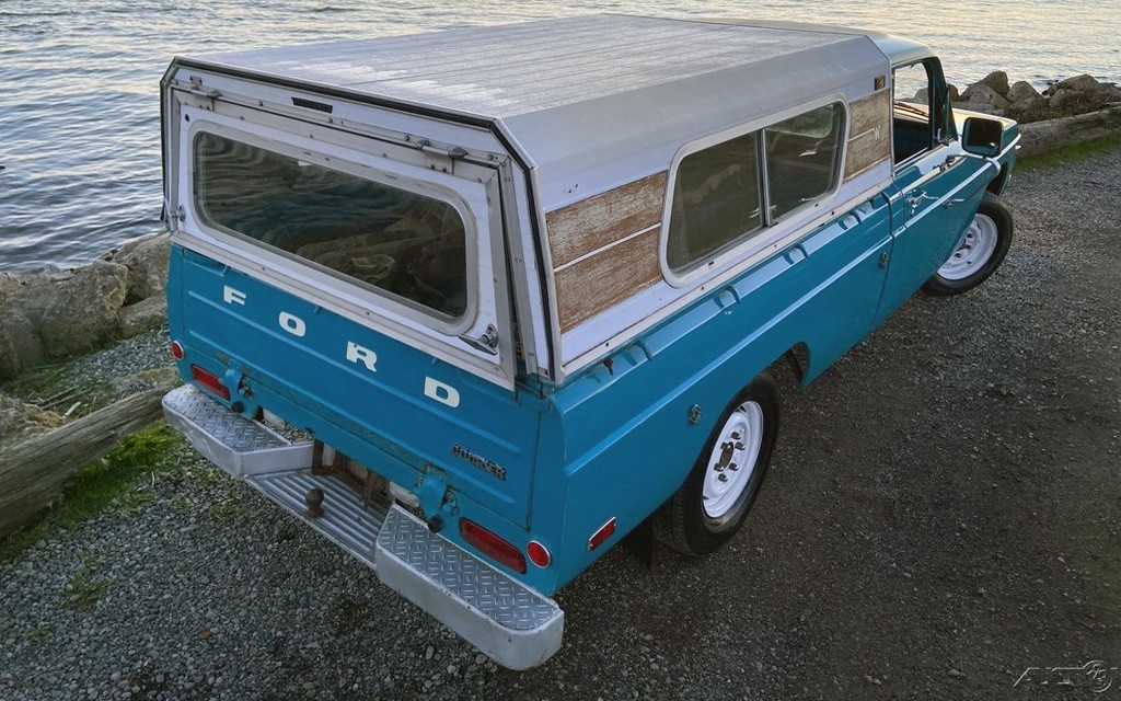 Believe it or not, this beautiful, shiny paint is all original from 1975 and this truck has just under 84,000 miles on it. This Courier was sold new in the San Francisco area and it has never left the east bay area, according to the seller. The topper, or cap, or camper shell as the seller calls it, is also original, leak-free, and it was been on this truck for the last 45 years. And, it’s a Winnebago topper/shell which has to be fairly rare. Here’s what it looks like inside. Fantastic, and perfect for fishing and camping which is basically what this l’il blue beauty has been used for.