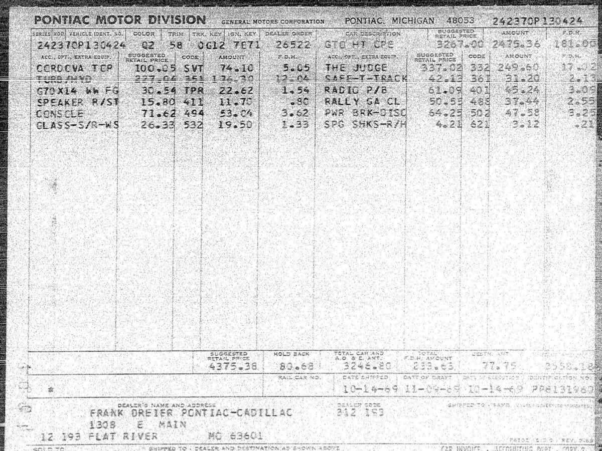 First a build sheet for Oct of 69; the 70s were already on dealers floors. This car is a 70. Front and back and inside. Second only the block will tell you which 400 it is. And beware. Most old ram air blocks are sold. Your looking at a frame off resto. Good luck still it’s a judge.