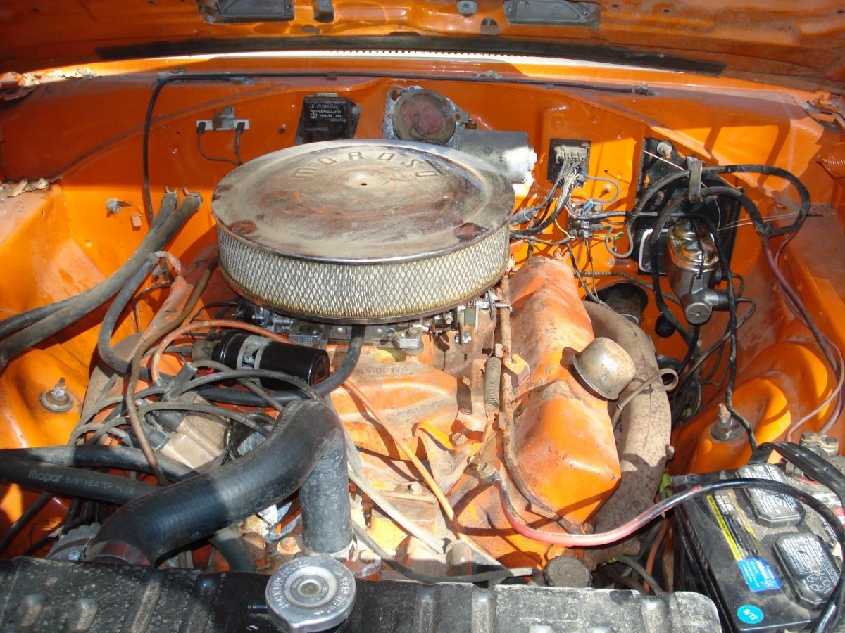 Here’s the 1970 GTX. It looks to be in about the same except in orange. It appears to have a new coil and a brake master cylinder. This engine is said to run like new.
