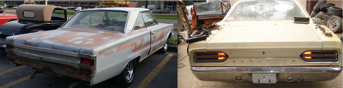 I’ve always preferred the 66/7 Plymouth body style over earlier/later versions…….both cars are cool nonetheless, I LOVE old iron!! SAD to see them left to such a rough state……