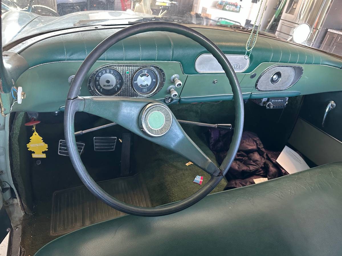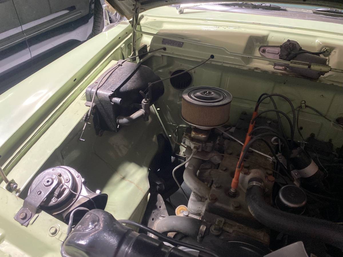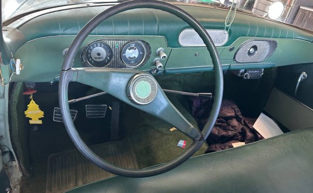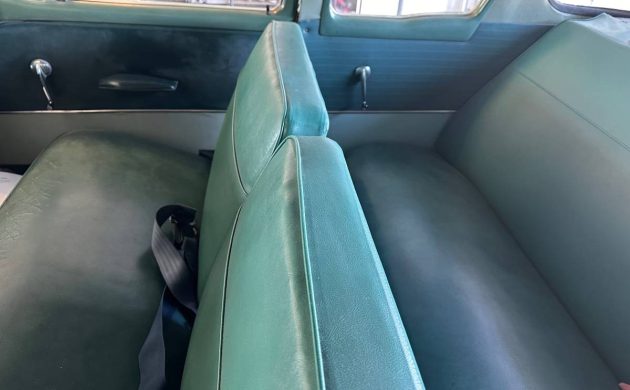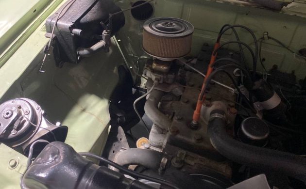 Interior-wise, it’s just the basics. An instrument panel doesn’t get much simpler than what we have here. If you note the radio location, it appears to be an add-on, as the factory location was where the aluminum block-off plate is positioned in the center of the dash. From what can be seen, the green vinyl upholstery and matching carpet are in good nick; possibly replaced?