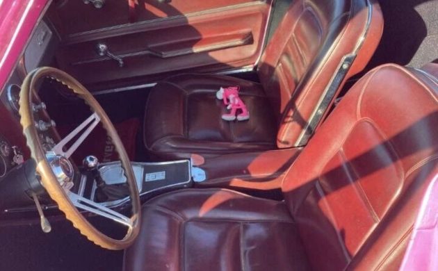 Of course, the defining feature here is the paint. The seller calls it a “one of a kind” Pink Panther Corvette, and whether that color choice is love-it-or-hate-it will depend entirely on the buyer. What’s clear is that this is not a car meant to quietly disappear at a cruise night. Combined with the maroon interior, it creates a look that’s unapologetically bold and very different from the more common mid-year Corvette color combinations.