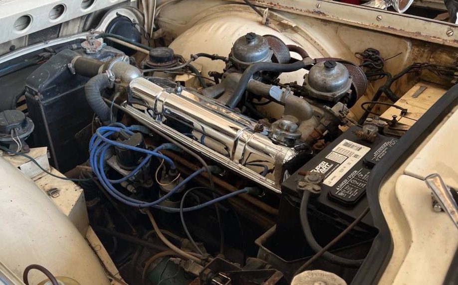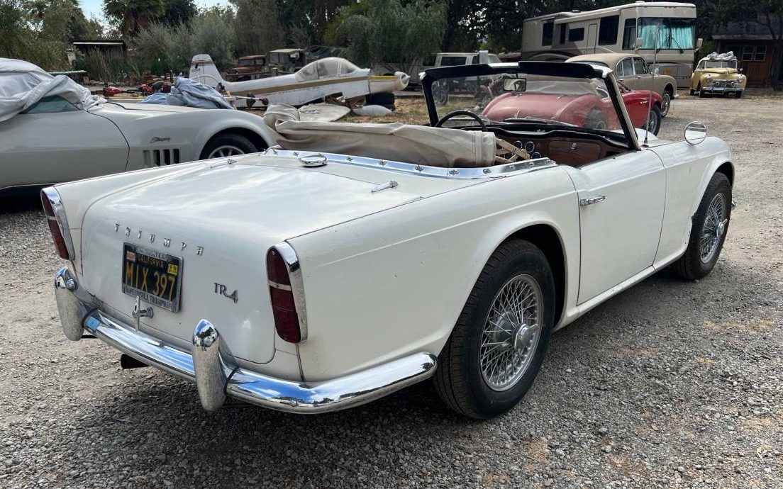 The best thing about this TR4 is the seller’s claim of, “Floors are excellent and no rust anywhere I can find” and “Just replaced the old windshield gasket and zero rust around the windshield“, both important matters as these cars can be bedeviled by rot and corrosion. The stainless trim is complete and it, along with the chrome bumpers, both still have a nice luster. The finish, which is claimed to be original, looks pretty fair too. Rounding out the exterior are the original white folding top and refinished wire wheels.