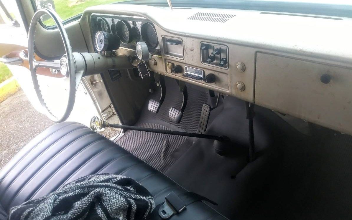 There is quite an amalgam of effects going on here but nevertheless, it all pulls together. The exterior was painted in the ’80s and it’s a twenty-footer – looks OK at a distance but it’s far from perfect and as the seller states, “has been touched up, scratched, chipped, etc. over the decades, has a great patina ‘don’t worry about scratching it’ look“. There is something to be said for that! There are some visible imperfections in places but the chrome, stainless trim, and wheel covers all make up for any shortcomings the finish may possess. And the entire effect is pulled together by virtue of this truck’s slammed stance. This is definitely a drive-it and enjoy-it kind of vehicle!