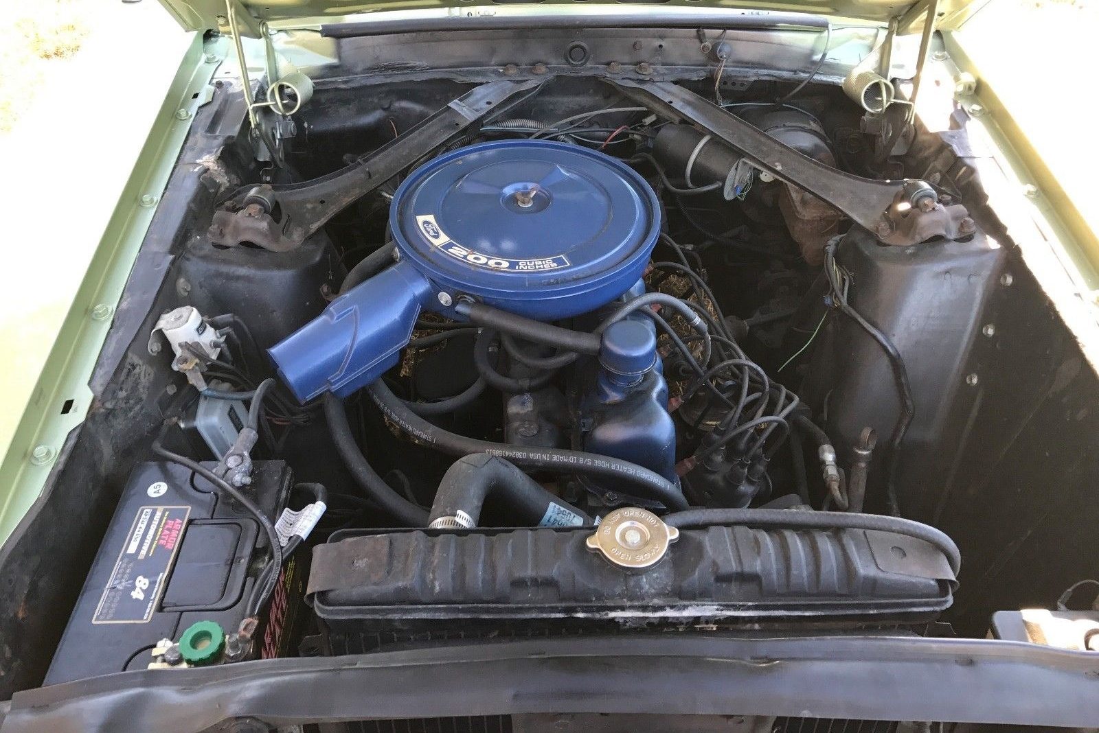 Although a Mach 1 style hood scoop has been bolted on, it is a simple case of false advertising as under the hood is the 200 cubic inch Ford “Thriftpower” inline-6. The fact that it is named “Thriftpower” should tell you volumes about this engine. The Ford 200 is an engine that makes a small, light car like a Mustang extremely fuel efficient for its time and still somewhat fuel efficient even by today’s standards. These engines are a breeze to work on in the Mustang engine bay, as there is ample room to work. This engine produces 120 horsepower, and the fact that someone chose this over the $40 extra 250 6-cylinder (with 155 horsepower) just goes to show that whoever this car was destined for bought it with cost in mind. The car has the original engine and transmission, both of which have been rebuilt.