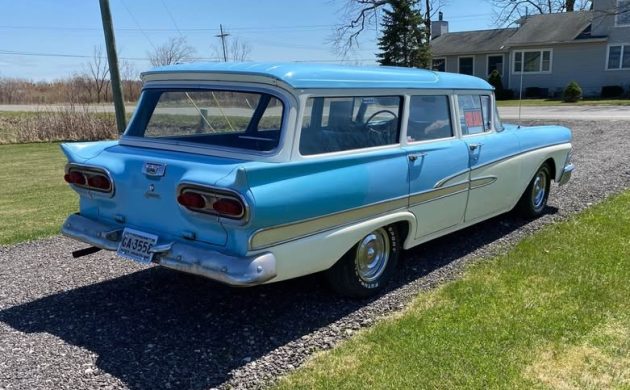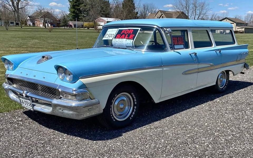 In 1957, for the first time in decades, Ford outsold Chevrolet for the model year; it wasn’t by much, but a win’s a win. Therefore, the blue oval entered the 1958 selling season flying high, but as we all know, 1958 wasn’t a good year for anyone but Rambler (and, individually, the Thunderbird). Without getting into economics, could Ford’s sales decrease (over 600,000 fewer cars sold than 1957) been partially due to its styling updates? Few think that the 1958 model was an improvement over the ’57, but you can see where Ford was going. They wanted a family similarity to the new (and very successful) four-seat Thunderbird, with bold grilles and quad headlights. And our criteria for buying a collector car isn’t the same now as it was when these cars were new; for some reason, a car tugs at our heart, and that’s it. Tireless T.J. found this Ford Country Sedan on Marketplace in New Boston, Michigan, with an asking price of $13,500. (Note to sellers: If you’re going to ask $13,500 for a car, remove your $12,500 sign from the windshield.)