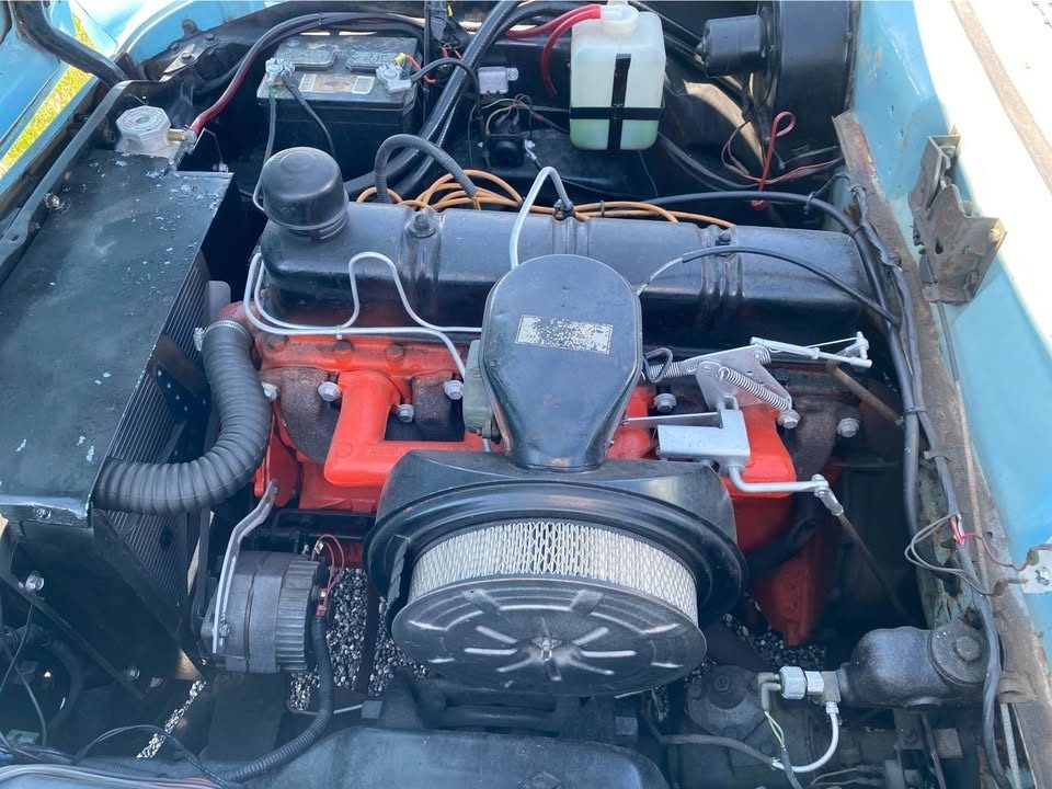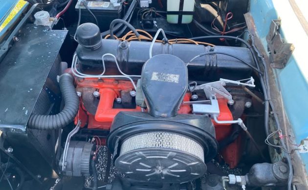 The 223 made 145 horsepower for 1958, and the stock Holley one-barrel (a 1904, I believe) sits atop the intake manifold. Few people like the Holley 1900 series carburetor because they tend to leak from the bowls (they’re easy to warp over the years), but if the rest of the engine compartment is any indication, the current owner probably has the problem figured out.