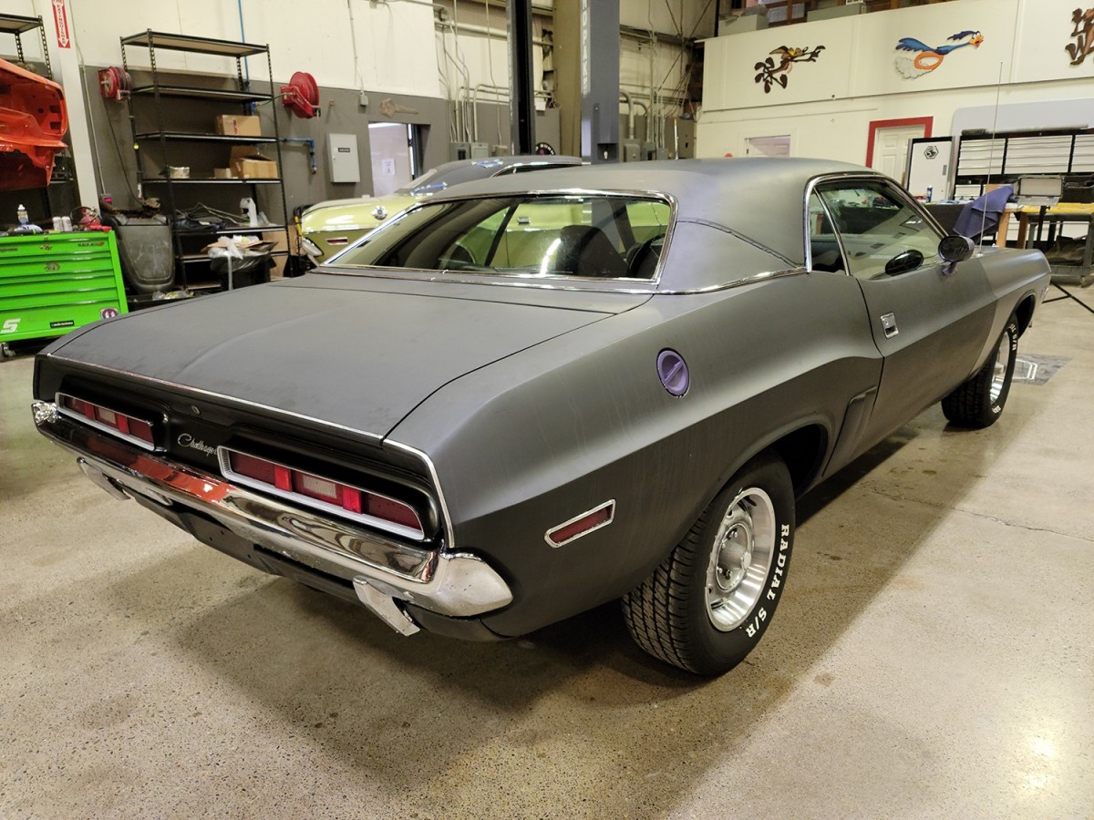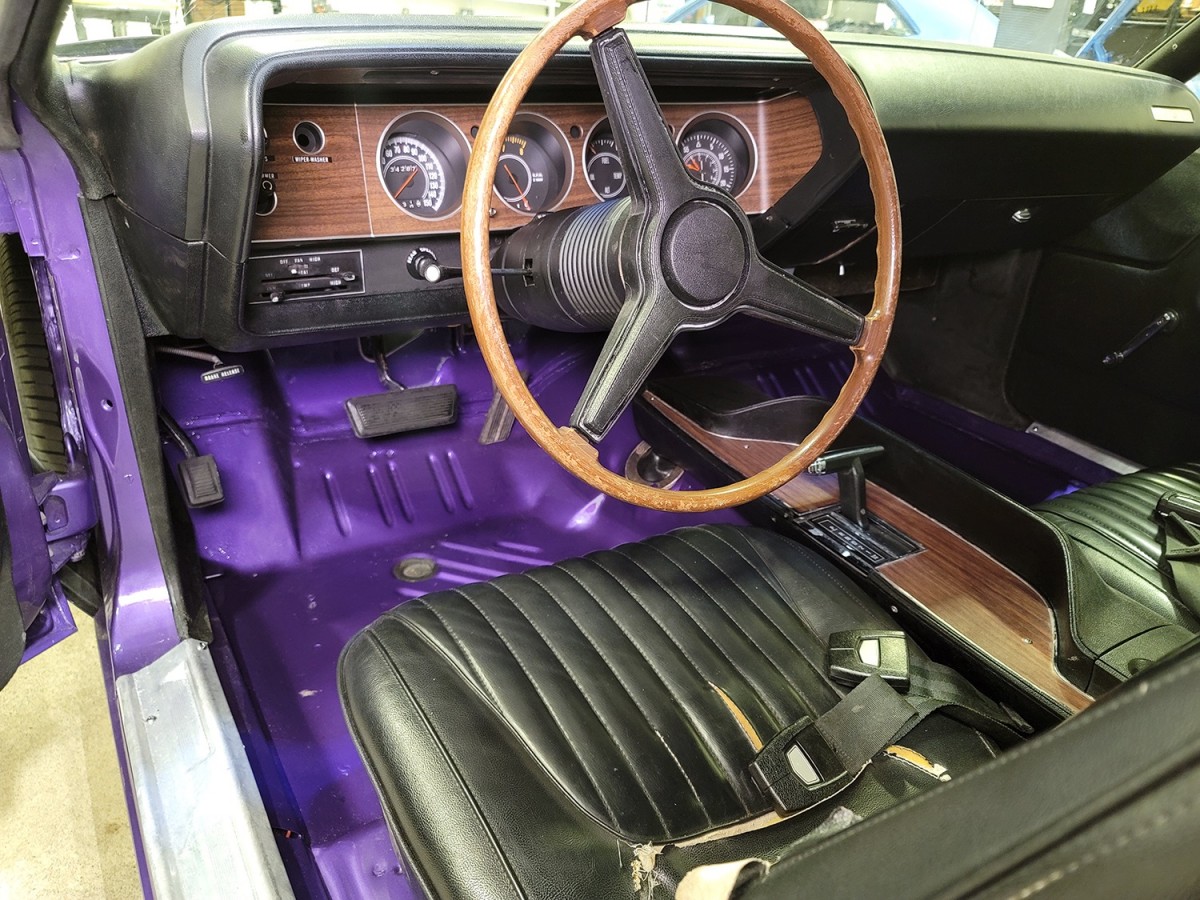 Most of the sheet metal has been rehung and aligned, but some minor work will still be needed before the body can be finished. The car looks to be wearing a new black vinyl top when you compare some of the photos. And the work was not limited to the exterior as the passenger cabin, trunk and engine compartment have been prepped and repainted in FC7 (Plum Crazy) with a base clear coat added. The only thing that seems to be missing is the radio.