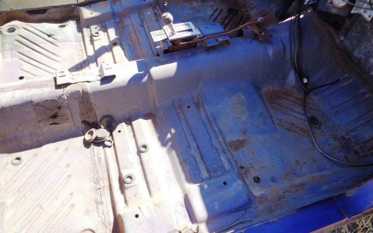 On the plus side, solid metal showing original Plum Crazy paint appears in nearly every picture, and the knowledgeable seller provides many pictures and a good run-down of the car’s good and bad. Original equipment on this true R/T included 383 cid (6.3L) V8 engine with automatic transmission, and this picture shows the original “Slap Stick” shifter mechanism in place.