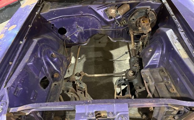 Inside, the car retains its original black bucket seats, rallye dash, and console, with the factory AM/FM radio and rare three-speaker dash setup still present. Much of the trim is included, and the seller notes that even the space-saver spare and inflator bottle remain, a rare bonus for a car that’s clearly spent time off the road.