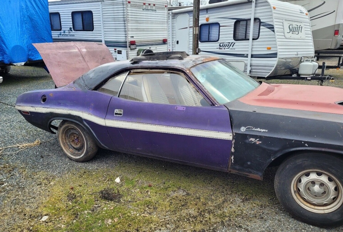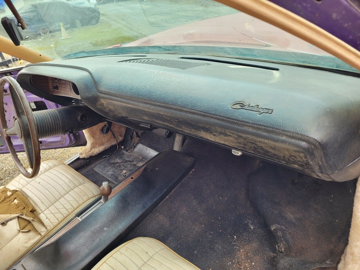 One thing’s for sure. Looking at the original sheetmetal on this Challenger, it appears to have been simply a low-level model (Non-R/T) from the factory; it has the side stripe that many pedestrian `70 Challengers carried, and the plum crazy color was available to every model.