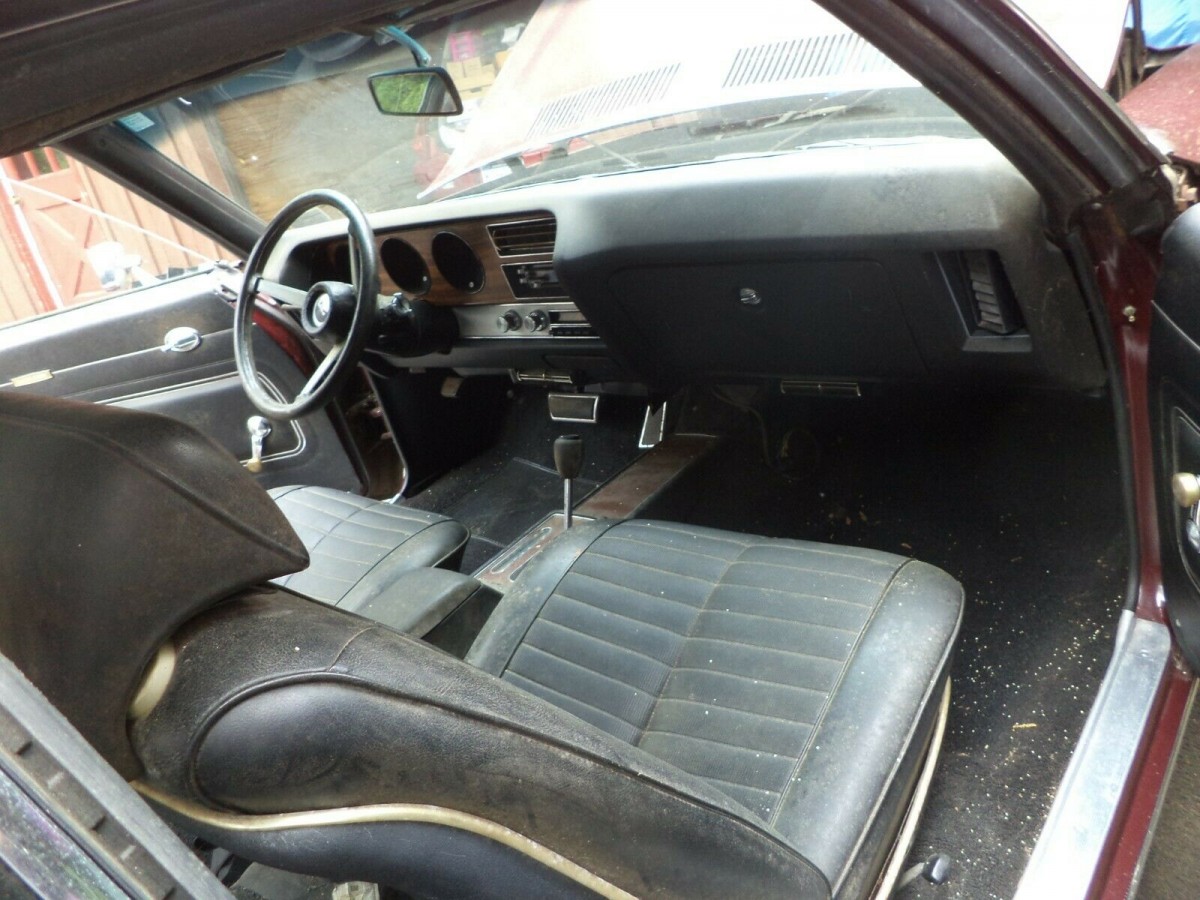 The burgundy paint is original on this Pontiac and it’s quite tired looking, as you might expect. The only reported rust on the car is some surface corrosion that is building in a couple of places. The frame is a bit crusty, but it doesn’t go deeper than that. Everything is said to be there, and no parts are missing from the body. All the glass seems good and there is a tinted bar running across the upper portion of the windshield to cut down on glare. The factory vinyl top looks nice with no indication of rust trying to bubble through from underneath.