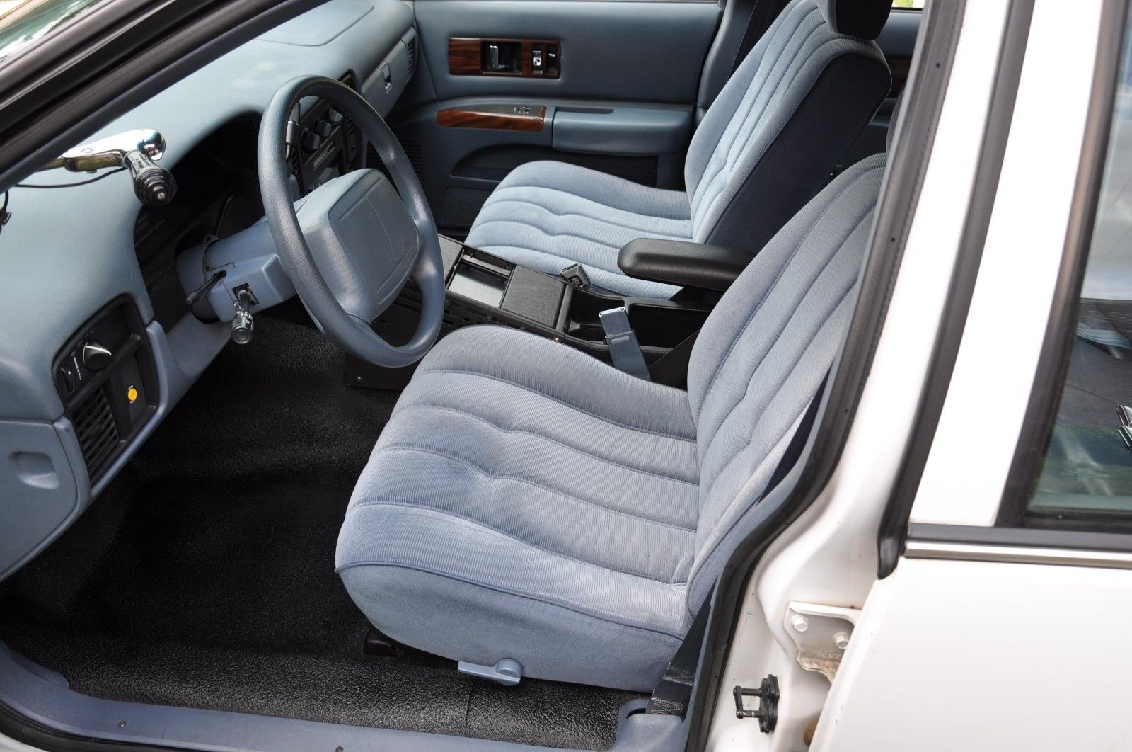 Like most police-spec vehicles, this Caprice is outfitted with cloth front seats and what appear to be vinyl rear seats. Both sets of seats are in immaculate condition and a very nice light blue. This is an interior color that disappeared along with the Caprice in the late ’90s, and it is very appealing compared to having a black or tan interior. The floor is covered in a durable rubber material typically found only in base-model trucks and service vehicles, such as this Caprice. This material is very easy to maintain, and only makes me want this car more! Both spotlights are present and appear functional, as well as the digital gauge cluster. The dashboard appears un-cracked and un-warped, a testament to the care this car has received.