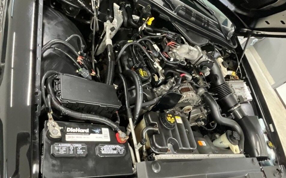 Under the hood, the 4.6 liter V8 is very clean looking in the bay and it’s gotten a fresh oil change plus new pulleys for the front components, with the engine idle meter showing fewer than 200 hours spent just sitting. The seller also mentions that no leaks are coming from the engine or transmission, no strange noises are present, and that this car needs nothing.