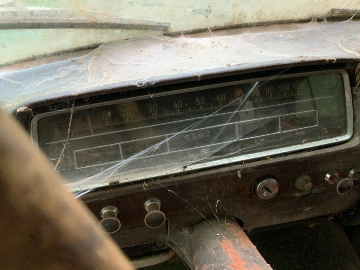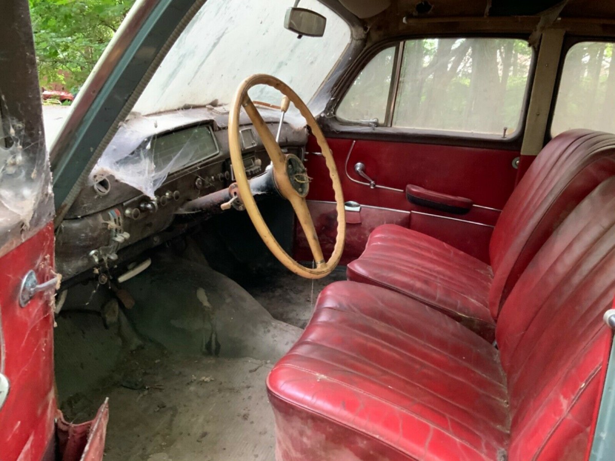 The title is missing, which is more of a problem in some states than in others. The positive elements are that intact red leather interior, an intact (but filthy) wooden dashboard with nothing missing, and all the original glass, without cracks or damage. It rolls.