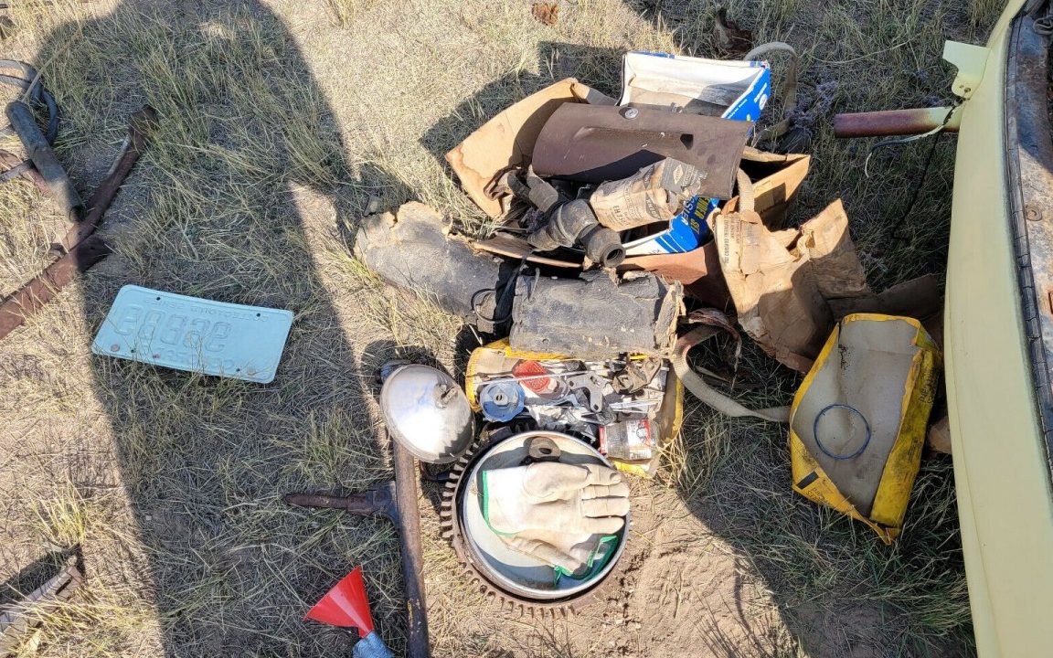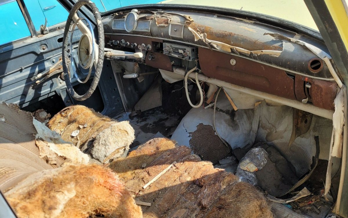The interior is best summed up by asking, “What the h@*! happened in here?” It is a total disaster of what looks like a tsunami of weather, age, neglect, and animal/rodent hi-jinx. Interestingly, there’s a corner broken off of the steel glove box door as if someone tried to pry it open – I’ve never seen that happen! It appears as if there is nothing of any value there though there is an aftermarket cassette player…and the ignition key.
