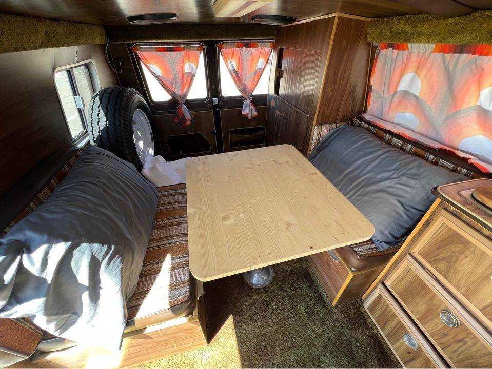The listing does not include photos of the pop-top area, but I can only assume that’s where you sleep – unless this table folds away and the bench pulls out. If it’s anything like a VW Westfalia, the canvas on the pop-up tent section can become fairly tattered, so you’d want to get a clear understanding of what you’re working with up top before assuming this Dodge is sleep-ready. Of course, when the seller says “crash pad,” perhaps he just means this was a mobile party rig for off-duty airline staff?