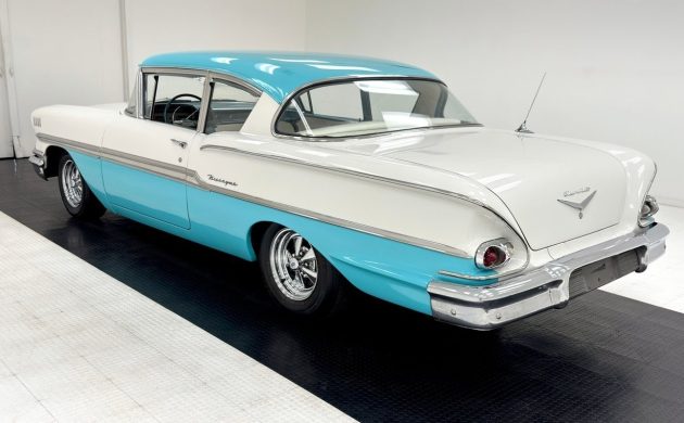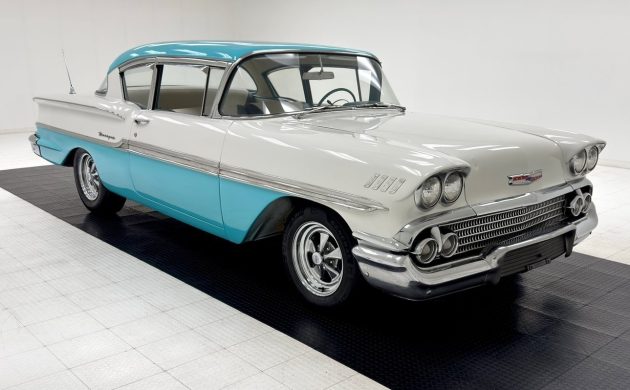 Chevrolet introduced the Biscayne in 1958 as a one-year-only body style. It offered the Sedan in two and four-door variants, with our feature car the former. It presents nicely at first glance, finished in a stunning combination of Tropic Turquoise and Arctic White. The seller confirms that this beauty has undergone a repaint, during which the Turquoise shade was applied over the original Glen Green. Close inspection reveals a few cosmetic marks and blemishes, and evidence of a small area of developing rust above one wheel arch. Of greater concern is the passenger-side lower rear quarter panel. I may be missing the mark, but its appearance suggests the possible presence of fiberglass. I am happy to be corrected if I’m wrong, but if there is fiberglass, I wonder what it might be hiding. Only an in-person inspection will reveal the truth, which is something I would negotiate before proceeding any further with this old Chevy. The underside shots reveal frame surface corrosion, but no evidence of penetrating rust or other issues. Some trim pieces require polishing or restoration, the glass is clear, and the Cragar wheels are period-correct for this classic.