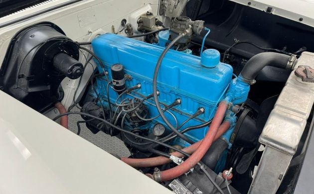 The car’s cosmetic refurbishment looks nice but that’s it. Underneath the fresh paint is an unknown. The spray-bomb rebuild of the engine is a warning. The consigner notes the horn, radio and blower motor along with the blower control are all non-functional. Also noted is vague steering. The freshly treated underside makes me wonder what is between it and the new carpet. What there is of an exhaust system ends right about the cowl.