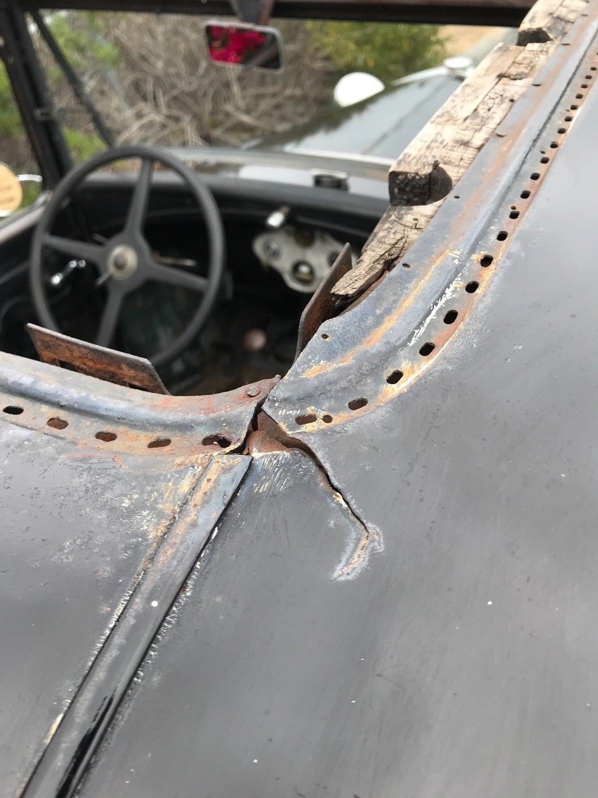 It was repainted and the seats were recovered sometime in the 1960s. The paint is still nice at 20 feet and it still runs and drives well. The seller says it has little rust, is solid and the doors and rumble seat close well. However, the top will need some work. The fabric insert is missing, the roof has several cracks and the wood top frame appears to have rotted away some. The door panels are gone but everything else inside looks OK. The seat recover was not done in the original style but it is serviceable.