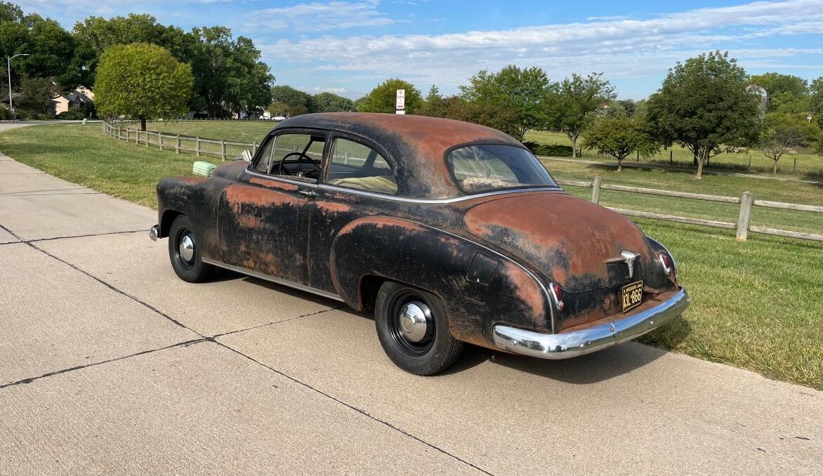 The interior will require some time and money. The headliner and door panels are MIA, and the seats need reupholstering (one of the photos almost catches the front seat). If you like patina, you could try keeping some wax on the metal or going for a lacquer coat over it all. Or simply get the car repainted, which is what I would do. Recent work on the old Bow-Tie entailed new brakes, a water pump, and the fuel-delivery system including the tank (that suggests the car was sitting for an extended period). With demand for the 1955-57 Chevies likely tapped out (a guess on my part), will the 1949-52s be the next group to raise interest?