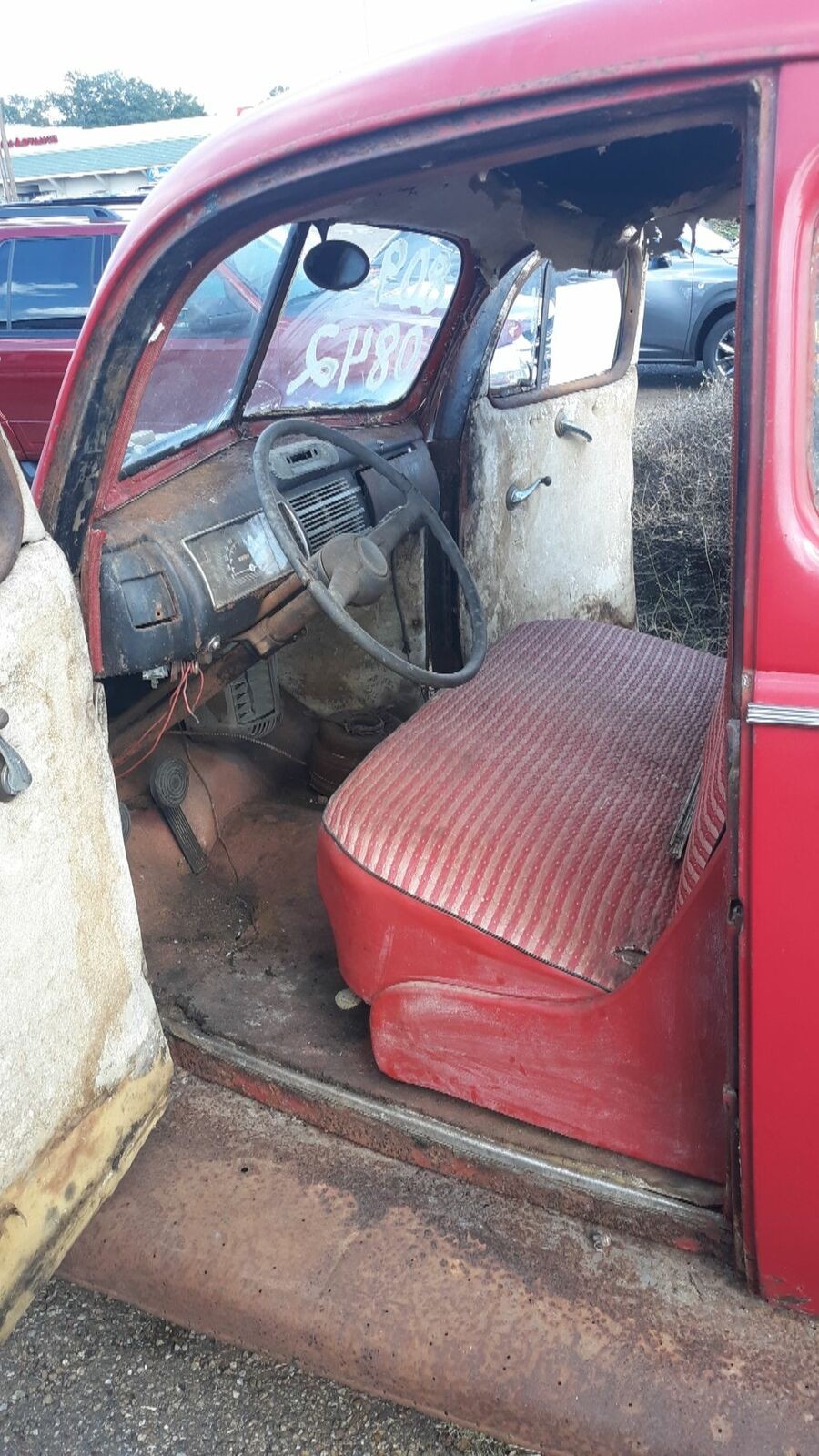 The interior would have to be reupholstered as well. There is no telling what is under that seat cushion, and the door panels are unsalvageable. All of the parts and pieces are there. This includes the desirable 1940 Ford steering wheel. It will also, unfortunately, need to be restored.