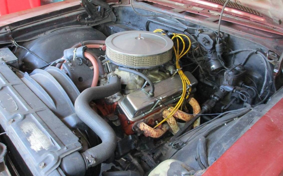 Taking a look under the hood, we can see there isn’t much rust to speak of. The black may be dusty but it definitely been inside. The car has a 350 that has been toyed with. Complete with headers, what looks to be an Edelbrock intake, a Holley 4bbl, and those performance valve covers, I would expect a few goodies inside. Mated to the factory 4 speed and hopefully a 12 bolt posi, it can most certainly smoke a set of tires.