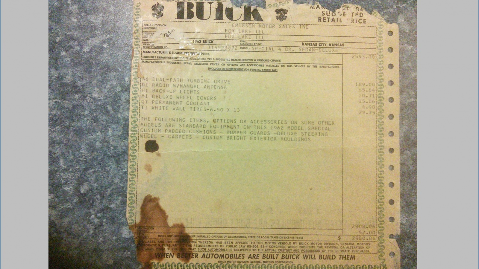 The sale includes the original window sticker and bill of sale. In case you can’t read the faded tiny lettering, the options on this car consisted of the two-speed automatic “Dual-Path Turbine Drive” ($189, and it surprisingly has nothing to do with a Powerglide), a radio with manual antenna ($65.64), back up lights ($10.71), deluxe wheel covers ($15.06), permanent coolant ($4.90, and I bet it wasn’t really permanent), and white wall tires ($29.75). The total with destination charges was $2960.06 (the average cost of a new car was $3,125, and you were putting $0.28/gallon gas in it).