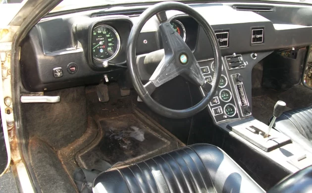 It’s also a desirable “Pre L” model which had a few very important distinguishing characteristics from the later cars. First, the bumpers are the preferred smaller chrome assemblies, which would later give way to the ugly black rubber covers that obscured the entire snout once U.S. safety regulators had their way. There’s also the dashboard, which featured the separate binnacles for the speedometer and rev counter. The rest of the cabin is standard Pantera fare, with the iconic vertical gauge array in the center stack. The black leather seats appear decent overall, especially for an unrestored car. There’s some further evidence of rust in the door hinge area.