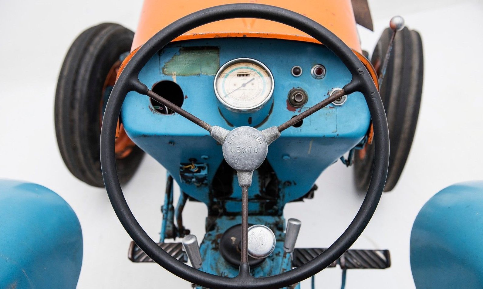 It’s amazing how many of the details you can associate with a company like Lamborghini: the three-spoke steering wheel, elevated center gauge, foot pedal controls with metal ribs – not exactly what you’d envision for a utilitarian apparatus like a tractor. The engine is paired to a four-speed gearbox, and although they were available with four-wheel drive, this 2R is a rear-wheel driven example. The chipped paint enhances its credibility as a working-class vehicle, but the next owner is unlikely to use it for anything other than display.
