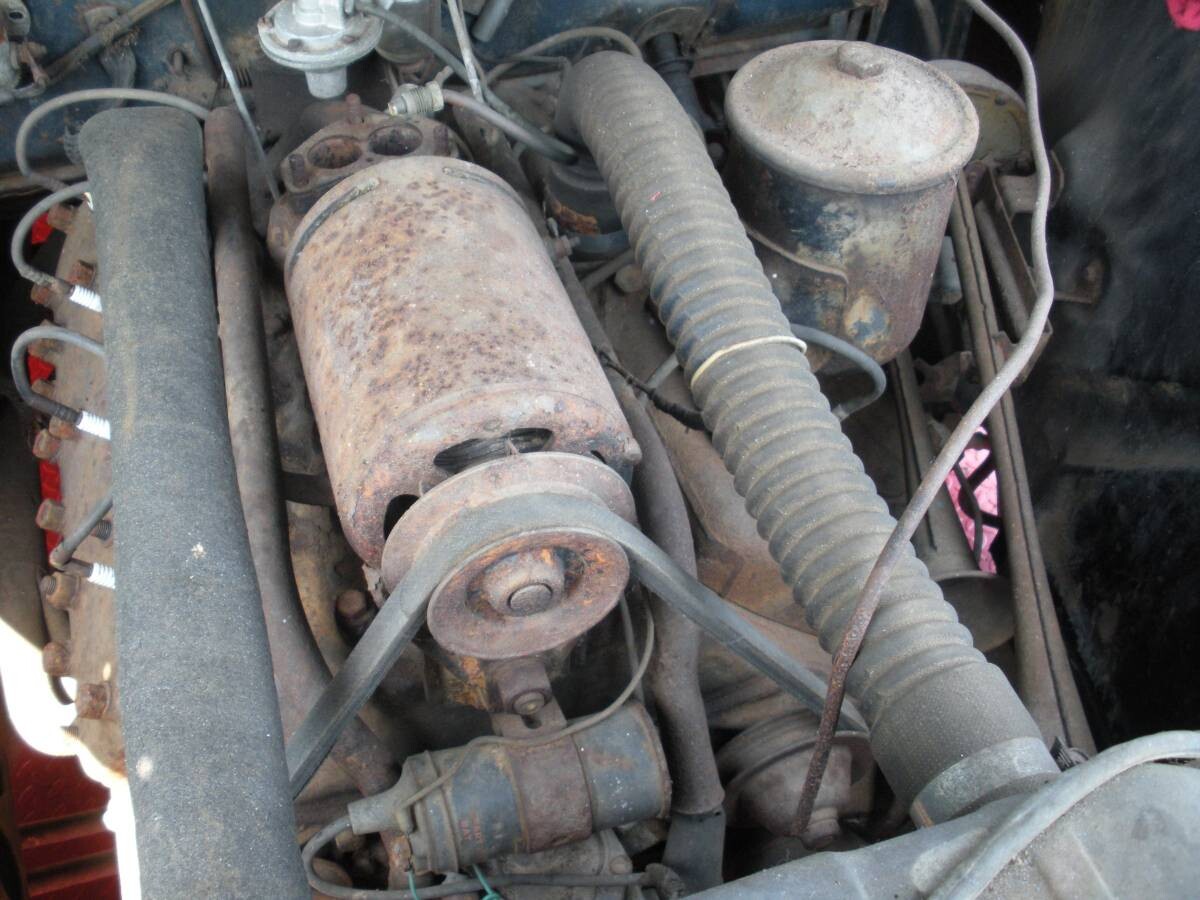 While we’re told the frame and body panels on this car are good, the blue paint is fading and peeling and may indicate a redo at some point. Some work, however, will be needed on the floorboards which have attracted some corrosion. Three of the glass panes are broken but what we can see of the interior might have salvageable portions. The carburetor is missing so a new one will be needed to try coaxing the V8 back to life. Depending on where you’re located, the dealer may entertain making a delivery since the car is already on a trailer.