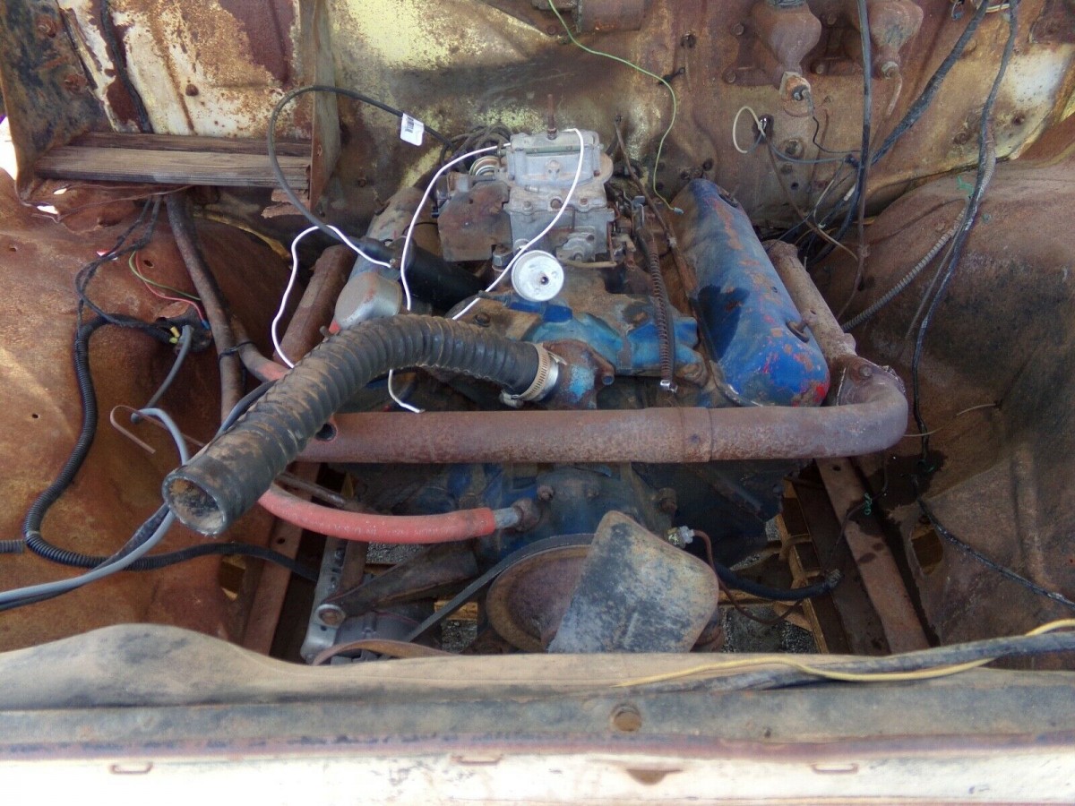 The engine in this F100 is supposedly the original 292 Y-Block. The seller says that they got it to light off by pouring some gas directly down the carb, but have not done the work to get it running and idling. Anyone with mechanical knowledge should not have to work too hard, since we at least know the engine isn’t seized. Hopefully there isn’t any internal issues to deal with. One thing that will probably be needed is some electrical work – you can see broken and loose wires all around the engine and interior of this truck, which are usually a sign of someone trying to fix electrical problems. You’ll notice the radiator is also missing from the engine bay, but it’s sitting in the bed of the truck right now.