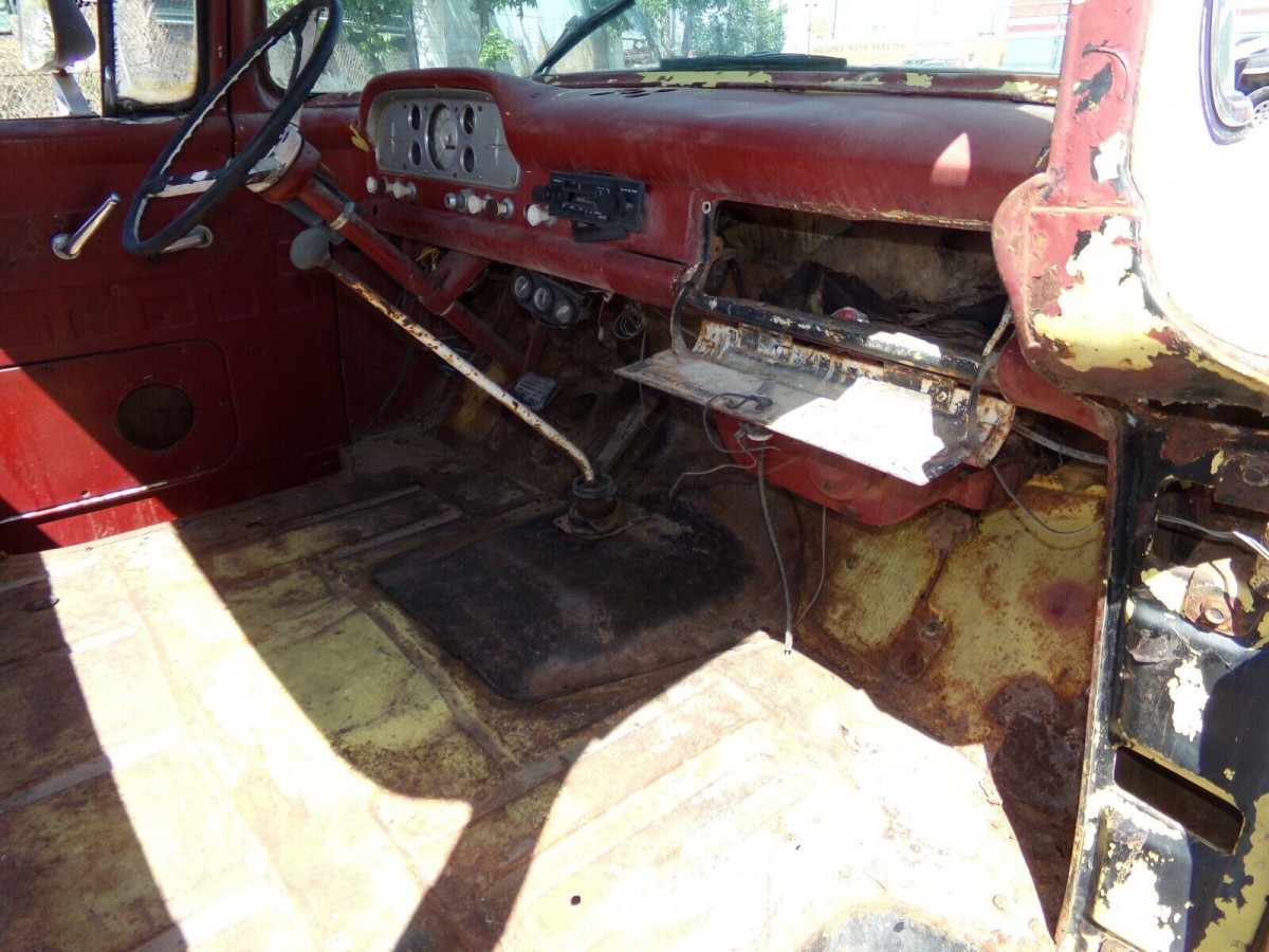 The interior of the truck looks sad at first glance, but may not need excessive work to be serviceable again. The headliner is missing, but there really weren’t that many soft surfaces to start with – the doors and dash were painted metal. Fortunately, the bench seat is located in the bed. From the other photos in the listing you can see 3 distinct paint colors on the door jambs – red, cream, and the current white. No word on the condition of the gauges, but I wouldn’t hold my breath. This is definitely a truck that needs some work, and would look awesome once restored. Is that what you would do, or would you give it a second life again while preserving it as-is?