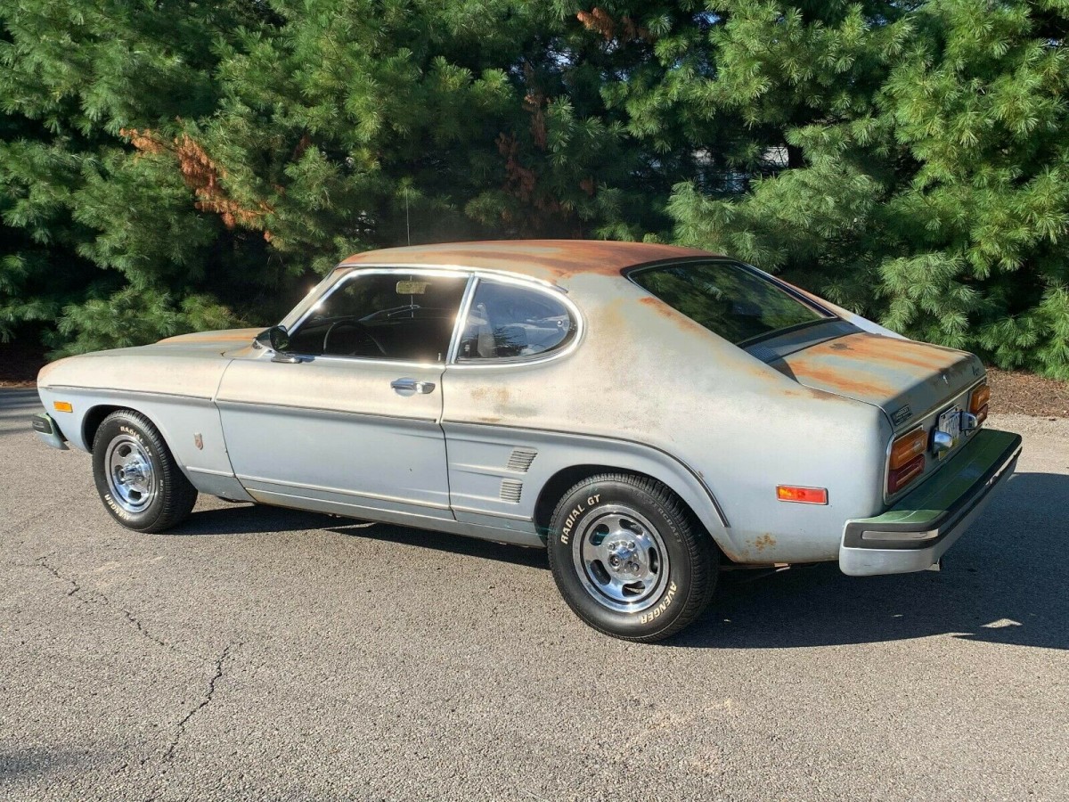 The Capri looks sharp on the inside, benefitting from a recent upholstery job, while the seller has left the outside alone to cash in on the sentiment right now that loves seeing nicely patina’d cars and trucks left alone. The seats appear to be in mint condition, as does the center console, and while the door panels and armrest are clearly used, they’re in a nicely preserved state. The steering wheel is original and it looks to have the factory radio as well, and the fake woodgrain trim around the instrument cluster is in good order. The carpets show no signs of blemishes or obvious rips and tears, and the dash doesn’t appear to be cracked, either. It’s always good to see a manual gearbox in one of these.